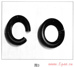 (2) 當(dāng)充泄氣體球閥開啟,在瞬間的小開度時(shí)介質(zhì)的流通間隙小,會使壓力瞬間增大,氣體或循環(huán)油首先直接沖擊在0型密封圈邊緣部位,由于0型密封圈的耐壓程度是有限的(一般不超過800Pa),就會瞬間將密封圈邊緣造成嚴(yán)重沖刷,從而影響閥門的密封性能和使用壽命。圖3為被沖擊破壞的0型密封圈。