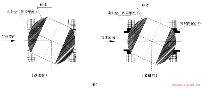 針對以上的原因及現(xiàn)象,結(jié)合液壓子站工作特點(diǎn)研究認(rèn)為:閥門內(nèi)漏原因和密封圈損壞現(xiàn)象提出,如果在氣動球閥內(nèi)加一保護(hù)密封圈裝置,避免密封圈直接與雜質(zhì)、高溫氣液、液壓沖擊接觸,此問題就可得到較好的解決。改進(jìn)前后詳見圖4。