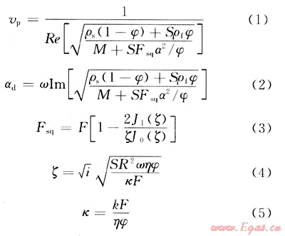式中:S為飽和度;J0為零階貝塞爾函數(shù);J1為一階貝塞爾函數(shù);ρs為固體密度;φ為孔隙度;ρf為流體密度;M為干噪骨架的單軸應(yīng)變模量;Fsq為固-流耦合系統(tǒng)的綜合壓縮性;α為有效應(yīng)力孔隙彈性系數(shù);R為特征噴射流動(dòng)長(zhǎng)度;ω為圓頻率;η為流體黏滯度;k為滲透率;F為固-流耦合系統(tǒng)的壓縮性;κ為干噪骨架體積模量。