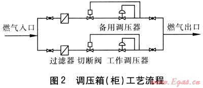 用戶調(diào)壓箱(柜)的功能是接受城市中壓管網(wǎng)來(lái)氣,并將天然氣壓力降至2500~3000Pa,輸送至庭院低壓管道供應(yīng)居民用戶使用[11]。調(diào)壓箱(柜)工藝流程(采用兩路調(diào)壓)見圖2。