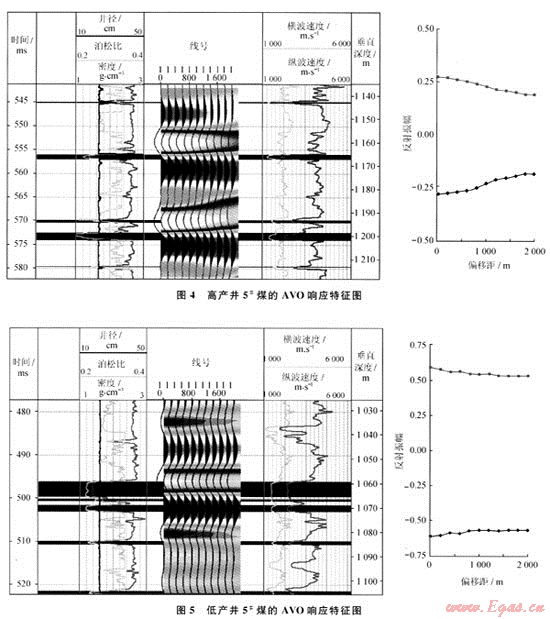 設(shè)定煤層氣高產(chǎn)井的產(chǎn)氣量Q≥1000m3/d,而低產(chǎn)井Q<1OOOm3/d,對高、低產(chǎn)氣井分別進行AVO數(shù)值模擬研究[9]。
