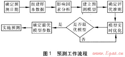 其工作過程如下:分析當(dāng)前需要預(yù)測日期前幾天負(fù)荷及歷史同期負(fù)荷變化情況,實(shí)時(shí)分析近期主要影響因素,作為模型輸入變量。對建模樣本數(shù)、是否考慮星期及節(jié)假日影響、模型主要變量數(shù)及模型結(jié)構(gòu)參數(shù)等尋優(yōu)。相當(dāng)于建立廠一系列不同的模型,根據(jù)歷史預(yù)測結(jié)果與實(shí)際結(jié)果的誤差大小確定評(píng)優(yōu)準(zhǔn)則及相應(yīng)的權(quán)值,由式(3)計(jì)算得出誤差平方和最小時(shí)對應(yīng)的預(yù)測模型參數(shù),再以評(píng)估確定的最佳模型進(jìn)行預(yù)測。當(dāng)預(yù)測結(jié)果的真值出現(xiàn)后,進(jìn)一步對預(yù)測結(jié)果進(jìn)行后評(píng)價(jià)及誤差統(tǒng)計(jì),為下一步預(yù)測時(shí)確定或修正評(píng)優(yōu)準(zhǔn)則提供依據(jù)。預(yù)測工作流程見圖1。