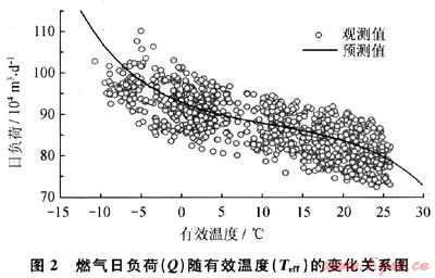 因此,根據(jù)觀測數(shù)據(jù)的分布情況,以有效溫度(Teff)為自變量可建立工作日期間燃?xì)馊肇?fù)荷預(yù)測模型,如式(3)所示。