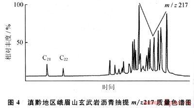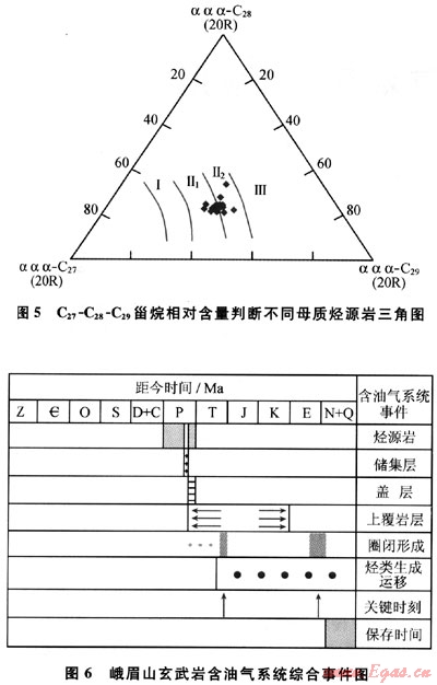 另?yè)?jù)玄武巖瀝青的m/z217質(zhì)量色譜圖(圖4),規(guī)則甾烷呈近“V”字形,C27占優(yōu)勢(shì),反映水生生物輸入有機(jī)質(zhì)較多,利用C27-C28-C29甾烷相對(duì)含量判斷烴源巖母質(zhì)類型(圖5),表明除水生生物外,還有部分腐殖型有機(jī)質(zhì)的輸入;由于上覆的沙灣組在漢王場(chǎng)-青神-犍為-珙縣以東地區(qū),已相變?yōu)楹谏?yè)巖夾薄層石灰?guī)r,有時(shí)可見薄層碳質(zhì)頁(yè)巖和煤層[3],故推測(cè)氣源可能有上二疊統(tǒng)煤系地層的貢獻(xiàn)。
