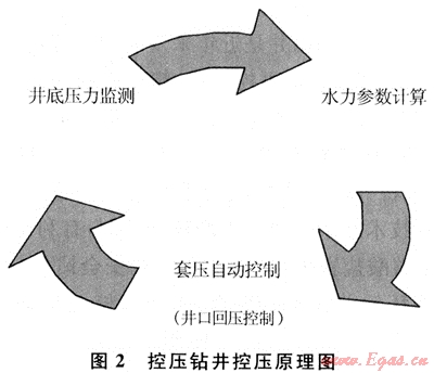 哈里伯頓控壓鉆水平井控壓原理:使用低密度鉆井液,通過(guò)對(duì)井底壓力的實(shí)時(shí)監(jiān)測(cè)、水力參數(shù)的分析計(jì)算、井口套壓(或回壓)的自動(dòng)控制,實(shí)現(xiàn)合理的井底壓力,始終保持井底壓差處于微過(guò)平衡狀態(tài),確保鉆井安全??貕恒@井控壓原理見(jiàn)圖2。