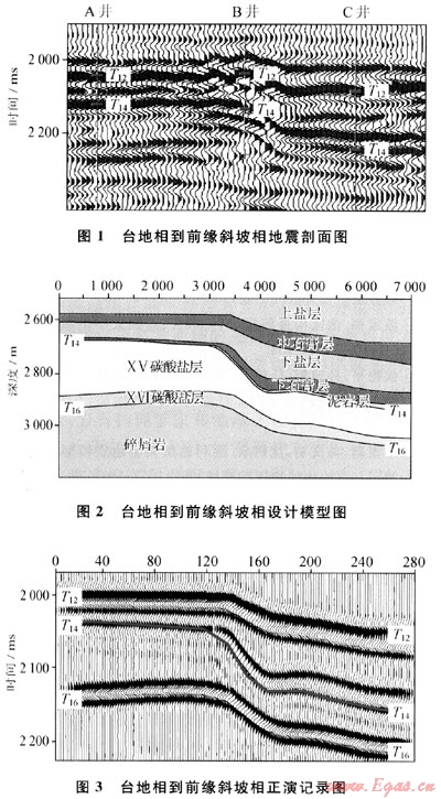 研究區(qū)3口測井資料對碳酸鹽巖頂界(T14)的標定結果見圖1。從圖中可見:臺地相和前緣斜坡相的碳酸鹽巖頂界并不在同一相位上。這對進一步的追蹤和解釋帶來了不確定性?;趨^(qū)域地質(zhì)和鉆測井資料分析,設計了沉積相變區(qū)地震地質(zhì)模型(圖2):臺地相ⅩⅥ碳酸鹽巖層厚度為50~70m,ⅩⅤ碳酸鹽巖層厚度為300~360m,下石膏層厚度為8~15m,下鹽層厚度為70~100m,中石膏層厚度為30~50m;前緣斜坡相ⅩⅥ碳酸鹽巖層厚度為40~60mm,ⅩⅤ碳酸鹽巖層厚度為80~180m,泥巖層厚度為4~38m,下石膏層厚度為20~80m,下鹽層厚度為40~200m,中石膏層厚度為100~140m;中下侏羅統(tǒng)速度為4100m/s,密度為2.40g/cm3;ⅩⅥ碳酸鹽巖層速度為5900m/s,密度為2.75g/cm3;ⅩⅤ碳酸鹽巖層速度為5600m/s,密度為2.65g/cm3;泥巖層速度為4200m/s,密度為2.45g/cm3;下石膏層和中石膏層的速度為6000m/s,密度為2.96g/cm3;下鹽層和上鹽層速度為4500m/s,密度為2.50g/cm3。取Ricker子波作為入射脈沖,依據(jù)實際地震資料選取的地震波主頻為30Hz。通過波動方程正演計算,得到的理論地震記錄見圖3。