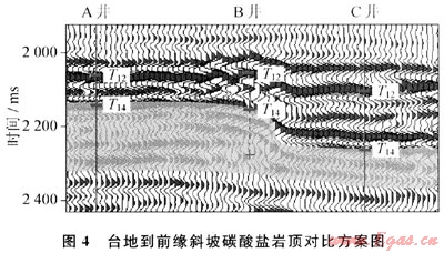 理論記錄與實際地震剖面的對比表明,從臺地相到前緣斜坡相,碳酸鹽頂界反射(T14)“竄相位”。這證明了井資料標定結果的準確性。圖中還可以看出,前緣斜坡相碳酸鹽巖反射振幅能量比臺地相的要弱一些,這與實際地震記錄的情況也是一致的。據(jù)此,落實了碳酸鹽巖頂界的解釋與對比方案(圖4)。