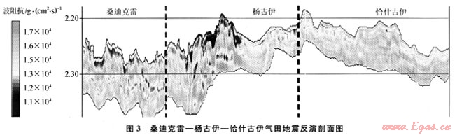 圖3為桑迪克雷-楊古伊-恰什古伊三維區(qū)自南西-北東向分布的反演波阻抗剖面。紅色低阻抗儲(chǔ)層,主要分布在碳酸鹽巖地層的上部,波阻抗值大約在15000g/(cm2·s);藍(lán)色為致密儲(chǔ)層發(fā)育段,具有低聲波時(shí)差、高密度的特征,與前述分析結(jié)果較為吻合。從反演結(jié)果可以看出,西南部桑迪克雷、楊古伊氣田波阻抗值相對較小,礁體較為發(fā)育,而東北部恰什古伊氣田波阻抗值相對較大,礁體發(fā)育程度較南部略顯致密。