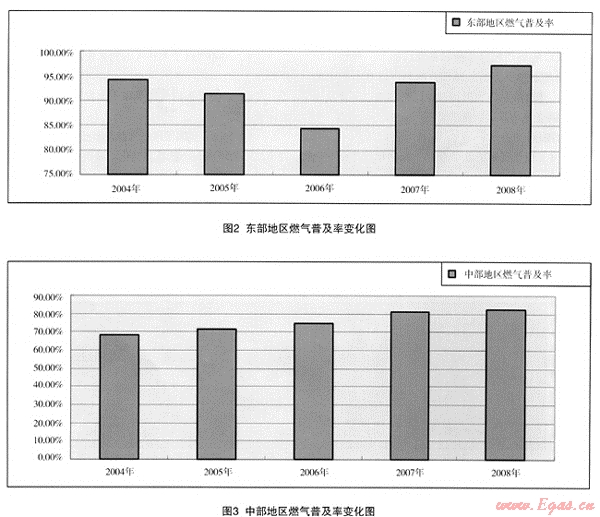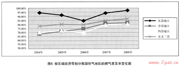 (1) 我國東部地區(qū)的燃氣普及率總體上高于其它地區(qū),其次為東北三省,中部和西部地區(qū)差別較少。西部地區(qū)有資源優(yōu)勢,2005年前,普及率較中部地區(qū)略高,但2006年后,中部地區(qū)又略高于西部地區(qū),證明燃氣普及率從總體上看與地區(qū)的經(jīng)濟發(fā)展關(guān)系較大,其次才是資源因素。