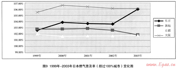 日本東京、新潟、京都、大阪1999年—2003年的燃氣普及率,見表3,變化狀況可見圖9。