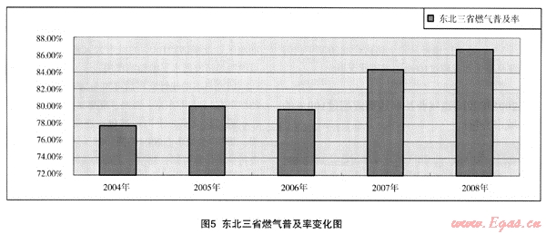 (2) 區(qū)域的燃氣普及率并不能完全代表各省、市、自治區(qū)的燃氣普及率水平。從2008年的情況看,東部地區(qū)的海南省只有73%,而中部地區(qū)的江西省燃氣普及率在90%以上,西部地區(qū)的重慶市也在90%以上。因此,作為規(guī)劃設(shè)計的重要計算數(shù)據(jù)使用時,還應(yīng)該進行具體分析,但東部地區(qū)普及率應(yīng)該在全國的平均數(shù)以上。