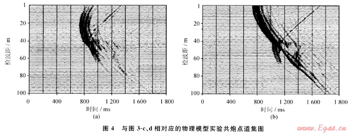 圖3為兩個楔形模型的射線追蹤圖,比較可以發(fā)現(xiàn),對于尖滅傾斜層來說,激發(fā)井相對地層為下傾或接收井相對地層為上傾時(圖3-b、圖3-d),其經(jīng)過尖滅傾斜層射線明顯多于上傾激發(fā)或上傾接收(圖3-a、圖3-c)。顯而易見,利用下傾激發(fā)上傾接收的井間資料進(jìn)行偏移成像或?qū)游龀上?,其得到的結(jié)果肯定優(yōu)于上傾激發(fā)下傾接收的結(jié)果。圖4是與圖3-c、3-d對應(yīng)的物理模型實驗炮集記錄,也表現(xiàn)出同樣的結(jié)果。數(shù)值模擬和物理模擬結(jié)果均表明下傾激發(fā)、上傾接收得到的井間記錄能更好地反映井間介質(zhì)的變化。