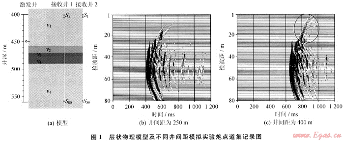 不同井間距接收的井間地震物理模擬實驗記錄分析表明,井間距的大小對所接收的波場有很大的影響。通過多種速度差的模型以及不同井間距的井間物理模擬實驗發(fā)現(xiàn),當(dāng)井間距小于300m時,記錄上未出現(xiàn)較明顯的折射現(xiàn)象,各種干擾波也相對簡單、易辨。模擬結(jié)果說明,設(shè)計井間地震觀測系統(tǒng)時,應(yīng)當(dāng)力求將射線的入射角控制在臨界角以內(nèi)。