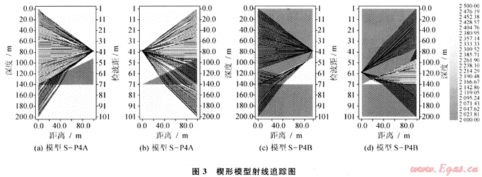 模擬結(jié)果表明,在設(shè)計井間地震觀測系統(tǒng)時,應(yīng)當(dāng)力求將射線的入射角控制在臨界角以內(nèi)。同時,為了更好地反映井間介質(zhì)的變化,應(yīng)該采取下傾激發(fā)、上傾接收的方式。因此,物理模型實驗可以為野外井間觀測系統(tǒng)設(shè)計提供直觀的依據(jù)。