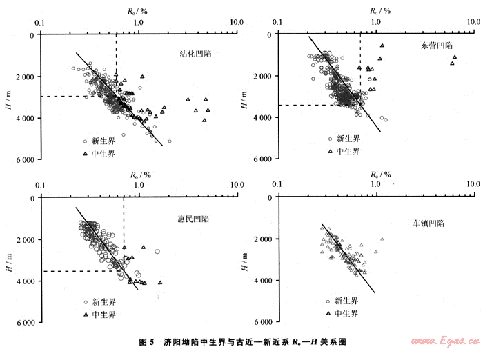 沾化凹陷中生界與新生界有機(jī)質(zhì)成熟度演化曲線相交于2900~3000m,其鏡質(zhì)體反射率在0.6左右。這表明,在新生界沉積前,中生界自身的沉積和較高的地溫梯度[9、21~23]已使烴源巖中有機(jī)質(zhì)的熱演化程度達(dá)到成熟階段。因而,通過(guò)新生代沉積進(jìn)而使中生界烴源巖再次活化生烴所需的門(mén)限深度大于3000m,Ro>0.6%(圖5)。