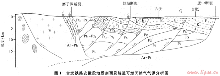 合武鐵路為合肥至武漢的客運(yùn)專線鐵路,途徑位于大別山的金寨區(qū)段。該區(qū)段河谷深切,相對(duì)高差最大達(dá)500m,共設(shè)計(jì)施工了17座隧道。自2005年10月28日~2006年1月9日,紅石巖、五福堂、九斗沖、周家坳、金寨、汀筒溝和喬家山隧道在施工過(guò)程中先后發(fā)生了不同程度的氣體燃燒現(xiàn)象,尤其是長(zhǎng)達(dá)7857m的紅石巖隧道曾發(fā)生過(guò)多次燃燒。片麻巖隧道出現(xiàn)可燃?xì)獾默F(xiàn)象是極其罕見(jiàn)的,筆者主要通過(guò)對(duì)大別造山帶合武鐵路金寨區(qū)段區(qū)域性片(麻)巖隧道燃燒現(xiàn)象的系統(tǒng)分析,結(jié)合大別造山帶、合肥盆地的演化特征和海相烴源巖發(fā)育狀況,探討合肥盆地油氣勘探前景及下一步的勘探思路。