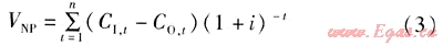 凈現(xiàn)值是指在一定的基準(zhǔn)收益率下,將各年凈現(xiàn)金流量都貼現(xiàn)為基準(zhǔn)年的現(xiàn)值之和,即工程項(xiàng)目逐年凈現(xiàn)金流量現(xiàn)值的代數(shù)和,公式如下: