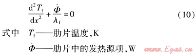 根據(jù)文獻(xiàn)[7],肋片中的發(fā)熱源項(xiàng)可表示為: