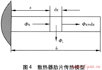 ② 對(duì)于散熱器根部溫度高于周圍空氣溫度的肋片,將其視為一維穩(wěn)態(tài)導(dǎo)熱問題,傳熱模型見圖4。