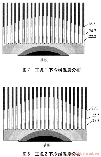 工況3:輸入電流為2.5A,保持熱端溫度為45℃,冷熱端溫差為35℃,熱電制冷器的制熱量為26.7W,冷端換熱介質(zhì)溫度為30℃時(shí),熱端肋片表面?zhèn)鳠嵯禂?shù)為230W/(m2·K),達(dá)到穩(wěn)定時(shí)熱端溫度分布見圖9。工況4:若冷端換熱介質(zhì)溫度為27℃時(shí),要獲得同樣的工作溫度,則熱端肋片表面?zhèn)鳠嵯禂?shù)為128W/(m2·K),熱端溫度分布見圖10。