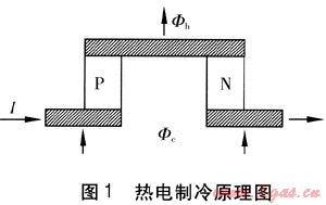由兩種具有不同熱電效應(yīng)的導(dǎo)體構(gòu)成的回路,通以直流電時(shí)產(chǎn)生吸熱現(xiàn)象,這種現(xiàn)象稱為熱電制冷。半導(dǎo)體材料具有較高的熱電勢(shì),可以成功地用來做成小型熱電制冷器,熱電制冷原理見圖1。N型半導(dǎo)體和P型半導(dǎo)體構(gòu)成的熱電制冷元件,用銅板和銅導(dǎo)線將N型半導(dǎo)體和P型半導(dǎo)體連接成一個(gè)回路,銅板和銅導(dǎo)線只起導(dǎo)電的作用。此時(shí),一個(gè)接點(diǎn)變熱,一個(gè)接點(diǎn)變冷,如果電流方向反向,那么結(jié)點(diǎn)處的冷熱作用互換。