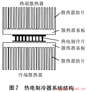 熱電制冷器冷熱端均采用鋁制散熱器進(jìn)行換熱,系統(tǒng)結(jié)構(gòu)見圖2,散熱器由基板和肋片構(gòu)成,基板長×寬×厚為75mm×63mm×8mm,肋片為等截面矩形直肋,肋長L=75mm、肋高h(yuǎn)=32mm、肋厚d=1.2mm、肋間距r=1.9mm,肋片數(shù)n=21。熱電制冷片與散熱器基板連接面涂抹導(dǎo)熱硅脂,以減小接觸熱阻。