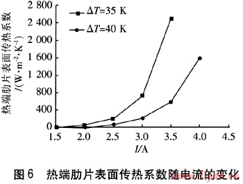 對(duì)于散熱面積和傳熱溫差一定的散熱器,提高表面?zhèn)鳠嵯禂?shù)是增加散熱量的有效方法。工作在不同冷熱端溫差下的熱電制冷器,在實(shí)際運(yùn)行中可根據(jù)輸入電流調(diào)整兩端換熱形式。由圖5可知,小制冷量時(shí),冷端可采用空氣自然對(duì)流傳熱,隨著制冷量的增加,則需要采用空氣強(qiáng)制對(duì)流傳熱或水冷等傳熱方式。由圖6可知,隨著電流的增加,熱端肋片表面?zhèn)鳠嵯禂?shù)急劇增大,風(fēng)冷難以滿足要求。