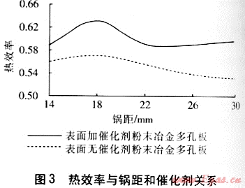 從圖3可以看出,粉末冶金多孔板在表面加催化劑時(shí)燃燒熱效率高于不加催化劑時(shí),因此表面加催化劑是必要的。當(dāng)鍋距較小時(shí),鍋底部離粉末冶金多孔板很近,鍋底溫度較低,降低了粉末冶金多孔板表面燃燒溫度,從而造成了不完全燃燒,降低了熱效率;隨著鍋距的增大,粉末冶金多孔板的表面溫度升高,熱效率升高,在鍋距為18mm時(shí)達(dá)到最大;隨著鍋距的進(jìn)一步增大,鍋底距離粉末冶金多孔板的距離太大,導(dǎo)致紅外線向周圍空間輻射增多,紅外線的熱損失增大,熱效率降低。