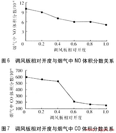 調(diào)風(fēng)板相對開度變大,過剩空氣系數(shù)逐漸增大,煙氣中NO生成量逐漸減少。當(dāng)調(diào)風(fēng)板相對開度≤0.4時(shí),空氣量嚴(yán)重不足,導(dǎo)致天然氣燃燒不充分,煙氣中CO生成量很高。在調(diào)風(fēng)板全開時(shí),空氣充足,煙氣中CO得以充分燃燒轉(zhuǎn)化為CO2,煙氣中CO體積分?jǐn)?shù)降低。