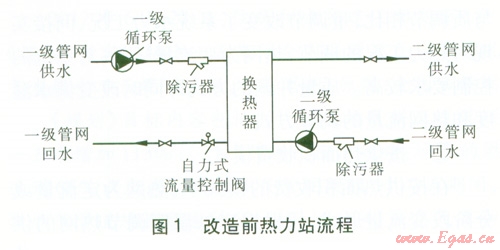 改造前,一二級(jí)管網(wǎng)均為定流量系統(tǒng),并采取質(zhì)調(diào)節(jié)方式。熱力站為全天值守?zé)崃φ?,熱力站?nèi)一級(jí)側(cè)回水管上安裝自力式流量控制閥,維持站內(nèi)一級(jí)側(cè)的流量恒定,改造前熱力站流程見圖l。