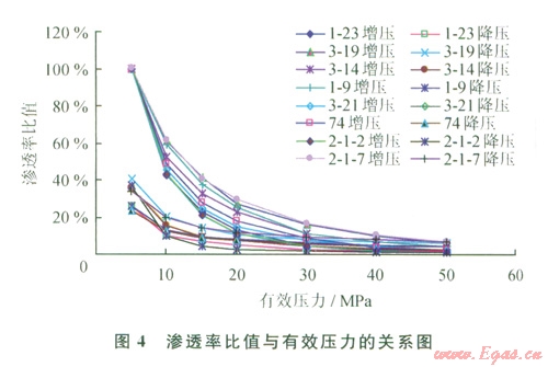 隨有效壓力的增大,巖樣滲透率急劇下降,下降幅度很大(圖3),尤其是在低壓力區(qū)間。以第一個(gè)壓力點(diǎn)(5 MPa)的滲透率為初始滲透率,計(jì)算不同有效壓力下滲透率與初始滲透率的比值——滲透率比,對全部實(shí)驗(yàn)數(shù)據(jù)進(jìn)行分析可以看出,當(dāng)有效壓力由5 MPa增大到20 MPa時(shí),滲透率下降為初始值的ll.0%~29.4%,平均為20.2%,即滲透率下降了約4/5;當(dāng)有效壓力增大到50 MPa時(shí),滲透率下降為初始值的1.10%~7.04%,平均為3.73%,即剩余滲透率都低于10%,表明滲透率的下降幅度非常大,應(yīng)力敏感性強(qiáng)。