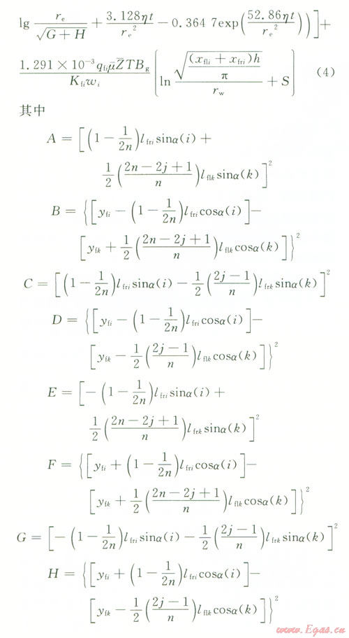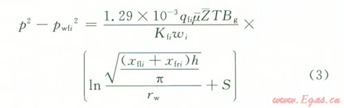 根據(jù)面積相等可得(xfli+ xfri)h=nRi2(式中xflixfri分別為第i條裂縫的左右翼的長度,Ri為氣藏的當(dāng)量半徑),所以第i條裂縫的流動可以看成是流動半徑為Ri,其中,地層厚度為ωi,邊界壓力的平方為裂縫尖端壓力平方p2(xfi,yfi,t),井底流壓為水平井井筒內(nèi)壓力pwfi的微型氣藏[7],其流動方式可以看成是氣藏的平面徑向流。根據(jù)氣井產(chǎn)能計算公式,可以把氣體由裂縫向井筒的滲流過程表示為: