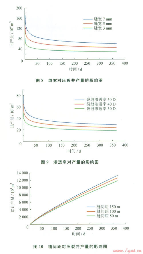 綜合圖810可以得知:壓裂水平氣井的產(chǎn)量是隨著裂縫寬度和裂縫滲透率的增加而增加,并且增長效果顯著。但是隨著滲透率和寬度的逐漸加大,產(chǎn)量增加的幅度在減?。涣芽p間距的增加也會引起產(chǎn)量的增加。因此,在壓裂方案設(shè)計和實際施工時應(yīng)把握好主要因素,使各參數(shù)的數(shù)值控制在合理的范圍內(nèi),最大限度地提高氣井產(chǎn)量。