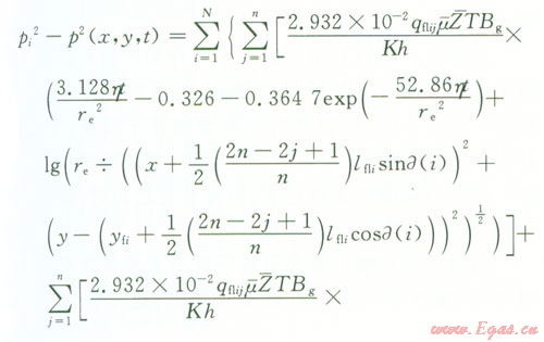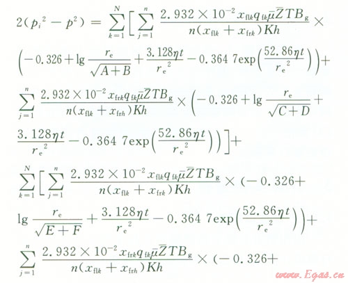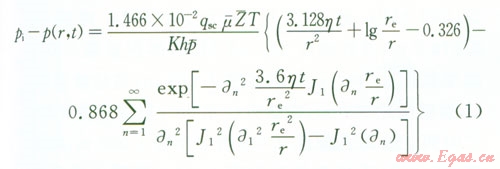 pi為原始地層壓力,MPa;p(x,y,t)為平面上的點(x,y)t時刻地層的壓力,MPap(-)為氣藏平均壓力,MPa;qsc為標(biāo)準(zhǔn)狀況下點匯處氣體的體積流量,l04 m3d;μ(-)為平均壓力和溫度下的氣體的黏度,mPa·s;Bg為地下氣體的體積系數(shù),無量綱;K為氣層滲透率,D;h為產(chǎn)層厚度,m;x0、y0分別為點匯的坐標(biāo),m;T為氣層溫度,K;re為封閉外邊界半徑,mt為滲流時間,hZ(-)為平均溫度和壓力下的天然氣偏差因子,利用D-A-K方法求;η為地層導(dǎo)壓系數(shù),μm2·MPa(mPa·s),η=K/(μCφ);an為方程X的根;J1、Y1為第一類、第二類一階貝塞爾函數(shù)。