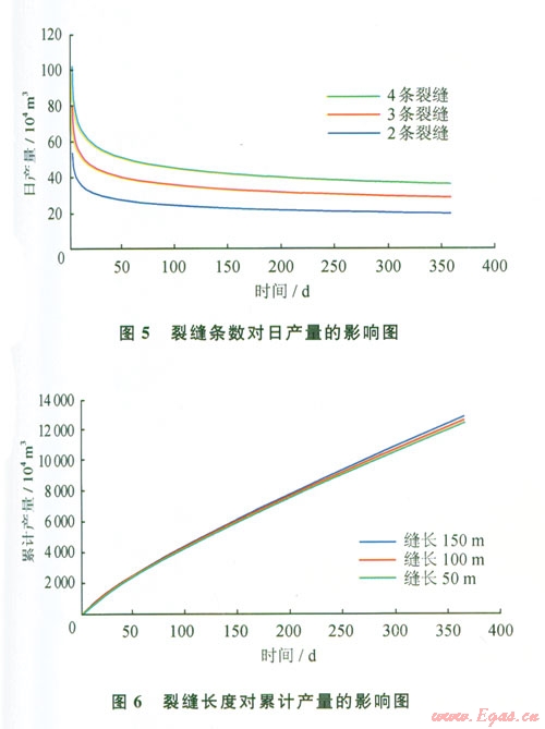 從圖56可以看出壓裂水平氣井的產(chǎn)量是隨著裂縫條數(shù)和裂縫長度的增加而增加,但是當(dāng)裂縫條數(shù)增加到一定大小時,壓裂井的產(chǎn)量增加并不明顯。因此并不是裂縫條數(shù)越多、裂縫長度越長,裂縫的產(chǎn)量就越高。因為當(dāng)裂縫的條數(shù)過多、裂縫長度過長時,裂縫間的相互干擾作用就會越嚴(yán)重。