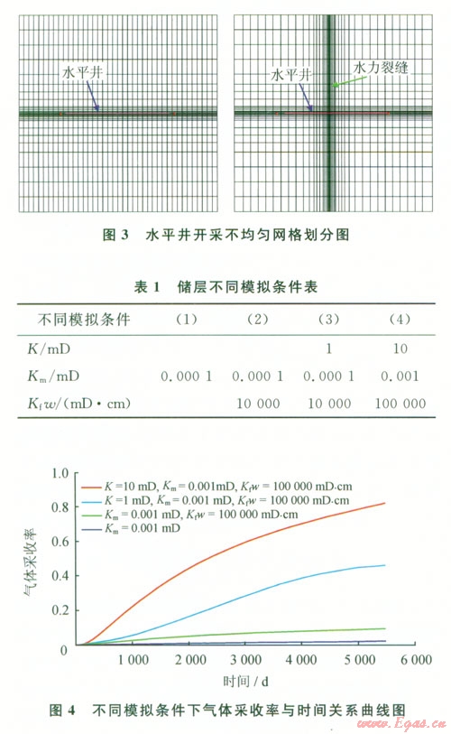 模擬結(jié)果表明,對(duì)于滲透率極低的頁巖氣藏,基質(zhì)滲透率和裂縫導(dǎo)流能力具有極端重要性;若不對(duì)儲(chǔ)層進(jìn)行壓裂改造,氣體采收率很低,不足5%,必須進(jìn)行壓裂才能得到有效開采;頁巖氣藏一般天然微裂縫發(fā)育,對(duì)儲(chǔ)層進(jìn)行水力壓裂若不能使得天然裂縫得到有效連通,增產(chǎn)效果不明顯,采收率只有10%;若對(duì)儲(chǔ)層實(shí)施大規(guī)模的壓裂改造,進(jìn)行體積壓裂形成復(fù)雜縫網(wǎng),則可以有效提高儲(chǔ)層裂縫的連通性和流體的流動(dòng)能力,氣體采收率可達(dá)80%。