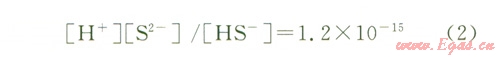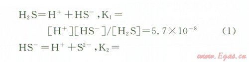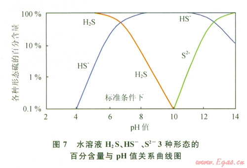 主要存在H2S、HS-、S2-3種形式。根據上式可以繪出H2S、HS-、S2-3種形態(tài)硫在不同pH值下的摩爾百分含量圖(圖7[8])。