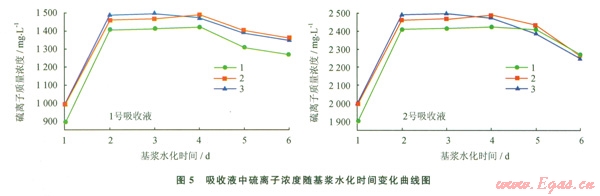 圖5中吸收液中硫離子濃度在基漿水化2 d后基本達到最大值,原因是此時膨潤土造漿效果最好,膨潤土比表面積較大;2~4 d內吸收液中硫離子濃度無明顯變化;5~6 d吸收液中硫離子濃度開始降低。分析原因是基漿放置5 d后,底部有明顯的膨潤土固體分層現(xiàn)象,膠體穩(wěn)定性變差所致[7]。因此確定基漿最佳水化時間為2 d。