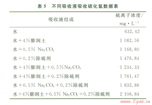 不同吸收液組成吸收硫化氫效果數據見表5。