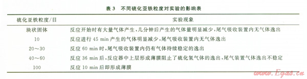 硫化氫氣體發(fā)生裝置中采用硫化亞鐵與稀硫酸按一定比例進行反應生成硫化氫氣體。實驗過程中硫化氫氣體產生的速度不夠穩(wěn)定,這主要與反應物硫化亞鐵的粒度以及反應溫度有關。實驗采用