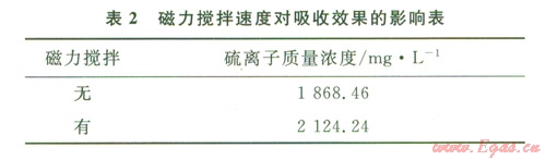 在吸收裝置中加有磁力攪拌來模擬井底流體的擾動,以期獲得吸收劑盡可能達到最大吸收效果。由于儀器條件的限制,實驗確定磁力攪拌器的轉速以磁轉子不產生跳動的最大穩(wěn)定轉速進行實驗,結果見表2。由表2可以看出吸收裝置中是否加有磁力攪拌,對吸收劑吸收效果影響較大,說明流體流動形態(tài)對氣液兩相傳質有很大影響。