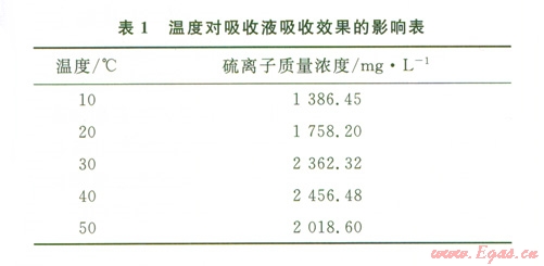 經過多次實驗發(fā)現(xiàn)不同室溫條件下所測數據有較大差異,在其他實驗條件相同的情況下,隨溫度升高,吸收液中硫離子濃度顯著升高。因此在吸收液吸收裝置下加恒溫磁力攪拌器以此調節(jié)反應溫度,并評價吸收液吸收效果,結果見表1。