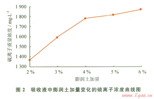 如圖2所示膨潤土加量對吸收液吸收效果有明顯的影響,但在膨潤土加量為4%以后,吸收液中硫離子濃度隨膨潤土加量的增加變化不大。分析產生這種現(xiàn)象的主要原因是膨潤土本身對硫化氫有一定的物理和化學吸附作用,物理吸附主要是硫化氫分子在膨潤土表面的吸附,化學吸附主要是發(fā)生在膨潤土膠體表面的陽離子交換吸附。