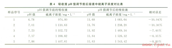 實驗發(fā)現(xiàn),吸收液在吸收硫化氫反應后溶液的pH值都低于l0。結合圖7中所示水溶液中硫化氫存在形態(tài)與溶液pH值的關系可知:在此pH值范圍內,吸收液中硫化氫主要以H2S和HS-的形態(tài)存在。分析在這種條件下用碘量法測得的硫離子含量不能真實地反映出吸收液中硫離子的含量。因此要在滴定前調節(jié)吸收液的pH值大于11,在此pH值范圍內溶液中硫化氫主要以S2-的形式存在。這樣可以接近真實的反應吸收液中硫化氫的含量。取圖4中1號吸收液吸收硫化氫反應后的溶液,對比分析pH值調節(jié)前后的數據,結果見表4。