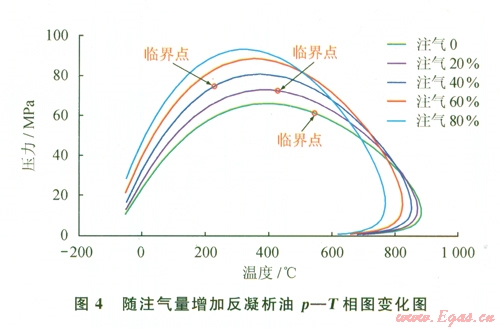 圖4為48.00 MPa下反凝析油與不同比例注入氣混合后p-T相圖變化特征。其中注入氣為采出分離器氣。由結(jié)果圖可見,隨著注入氣比例從20%增加到80%,臨界點(diǎn)從右向左偏移,當(dāng)注入氣摩爾含量超過40%后,整個體系在地層溫度l