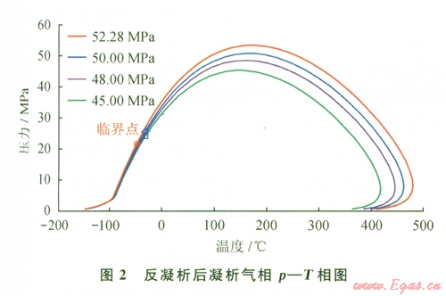 在反凝析組成分析的基礎(chǔ)上,模擬計(jì)算了不同壓力下地層凝析氣相的p-T相圖(圖2)。由圖2可見:從52.28 MPa下降到45.OO MPa,隨著壓力的減低,凝析氣露點(diǎn)壓力降低,包絡(luò)線向下縮小。始終處于飽和狀態(tài)。