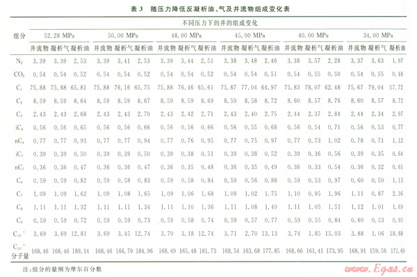 通過定容衰竭實(shí)驗(yàn)的模擬計(jì)算,可得到不同衰竭壓力下氣相、油相和井流物的組成,由此分析反凝析過程油氣組成的變化特征。本次計(jì)算出了從地層壓力52.28 MPa衰竭到34.OO MPa時不同壓力下反凝析油、凝析氣及井流物組成變化(表3)。