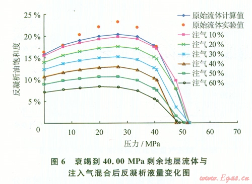 圖6為剩余地層流體與注入氣混合后反凝析液量變化。由圖6可見,注氣后混合物體系反凝析液量降低,注入氣所占摩爾含量越高,反凝析液量降低越多。當(dāng)注入氣摩爾含量達(dá)到60%時,最大反凝析液量約為7%,為原始井流物的30%。注氣量低于40%時,混合物體系注氣露點(diǎn)壓力略有升高,當(dāng)注氣量超過40%后體系露點(diǎn)壓力從53.OO MPa下降到49.OO MPa。