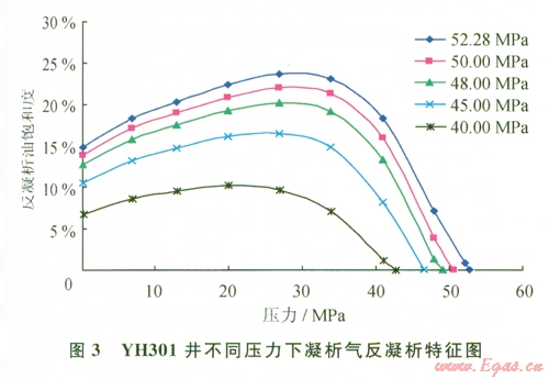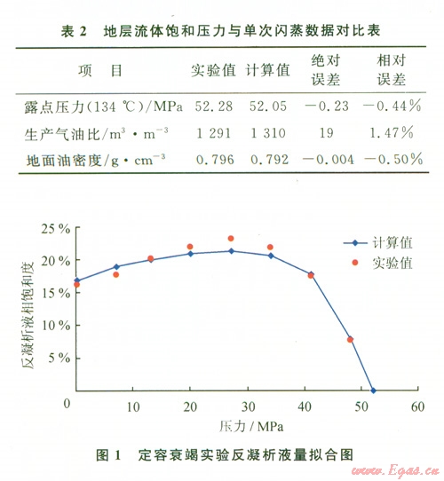 由表l和圖l可見:實(shí)驗(yàn)值和計(jì)算值相對誤差均小于2%,總體擬合效果較好,能滿足后續(xù)相態(tài)模擬計(jì)算的需要。最大反凝析液量高,達(dá)到23%。