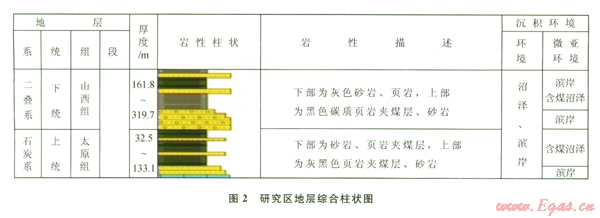 研究區(qū)上古生界石炭系太原組、二疊系山西組主要為海陸過渡沼澤相,發(fā)育富有機質(zhì)暗色泥頁巖、碳質(zhì)頁巖及煤層,泥頁巖連續(xù)厚度介于31.1~98
